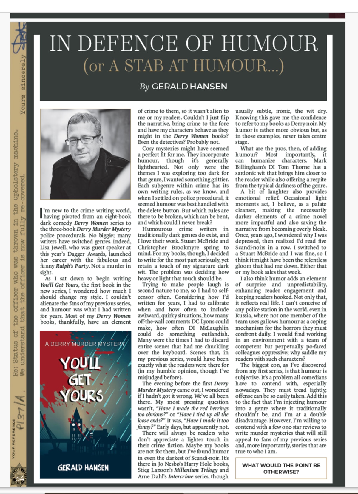 There will always be readers who don’t appreciate a lighter touch in their crime fiction. Maybe my books are not for them, but I’ve found humor in even the darkest of Scandi-noir. It’s there in Jo Nesbø’s Harry Hole books, Stieg Larsson’s Millenium Trilogy and Arne Dahl’s Intercrime series, though usually subtle, ironic, the wit dry. Knowing this gave me the confidence to refer to my books as Derry-noir. My humor is rather more obvious but, as in those examples, never takes centre stage.